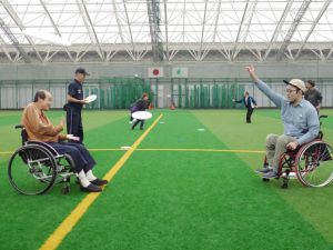 ■午前中は、アキュラシー競技(5m&7m)を行いますが、競技に入る前にしっかり練習をして頂きます。ディスクを円形の輪(アキュラシー)に10回投げて何回通過するのかと言う競技です。立位と車イスの部にて競います。