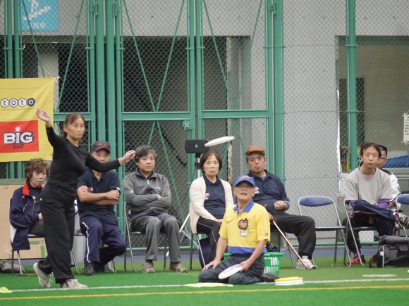 競技は、3回投げて一番遠くへ飛んだ地点を記録とします。ディスクが勢いよく遠くへ飛ぶと「ウワー、すごい」と歓声が沸きます。