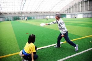 ・午前中は、アキュラシーゴール(リング)を目標にディスクを投げるアキュラシー競技(5mと7m)を実施。 開会式の後は準備運動を行いその後は練習の試投、練習の時はご家族も含め参加された皆さん成功率も高かったですが、いざ本番となると緊張のせいか、リングに当たったり反れてしまったりと失敗をする場面が多かったようです。緊張感の中でも、皆さん和気あいあいと楽しく競技をされていました。