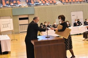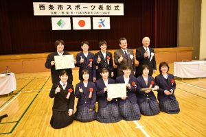 ◆令和4年度西条市スポーツ表彰式が2月25日(土)西条市総合体育館で、午後2時から開催されました。令和元年度より西条市との共催で開催しております。ご来賓として、西条市議会副議長 髙橋 保 様、西条市教育長 伊藤 隆志 様、西条市福祉文教委員長 井上 浩二 様のご臨席を賜りました。 開式の後、各受賞者の紹介、表彰状・記念品の贈呈、玉井敏久西条市長・田邊重義西条市スポーツ協会長の式辞、来賓の紹介を行い、髙橋保西条市議会副議長様からご祝辞をいただきました。表彰式の最後に受賞者を代表して廣田千代美氏が謝辞を述べ、式を終了しました。