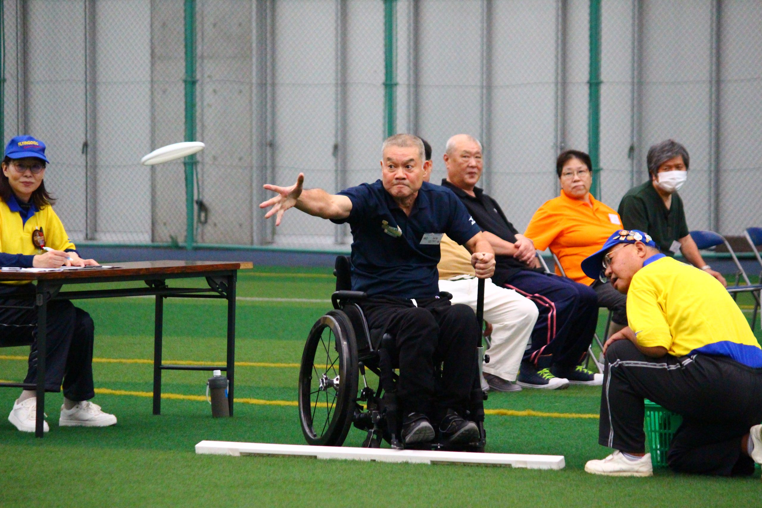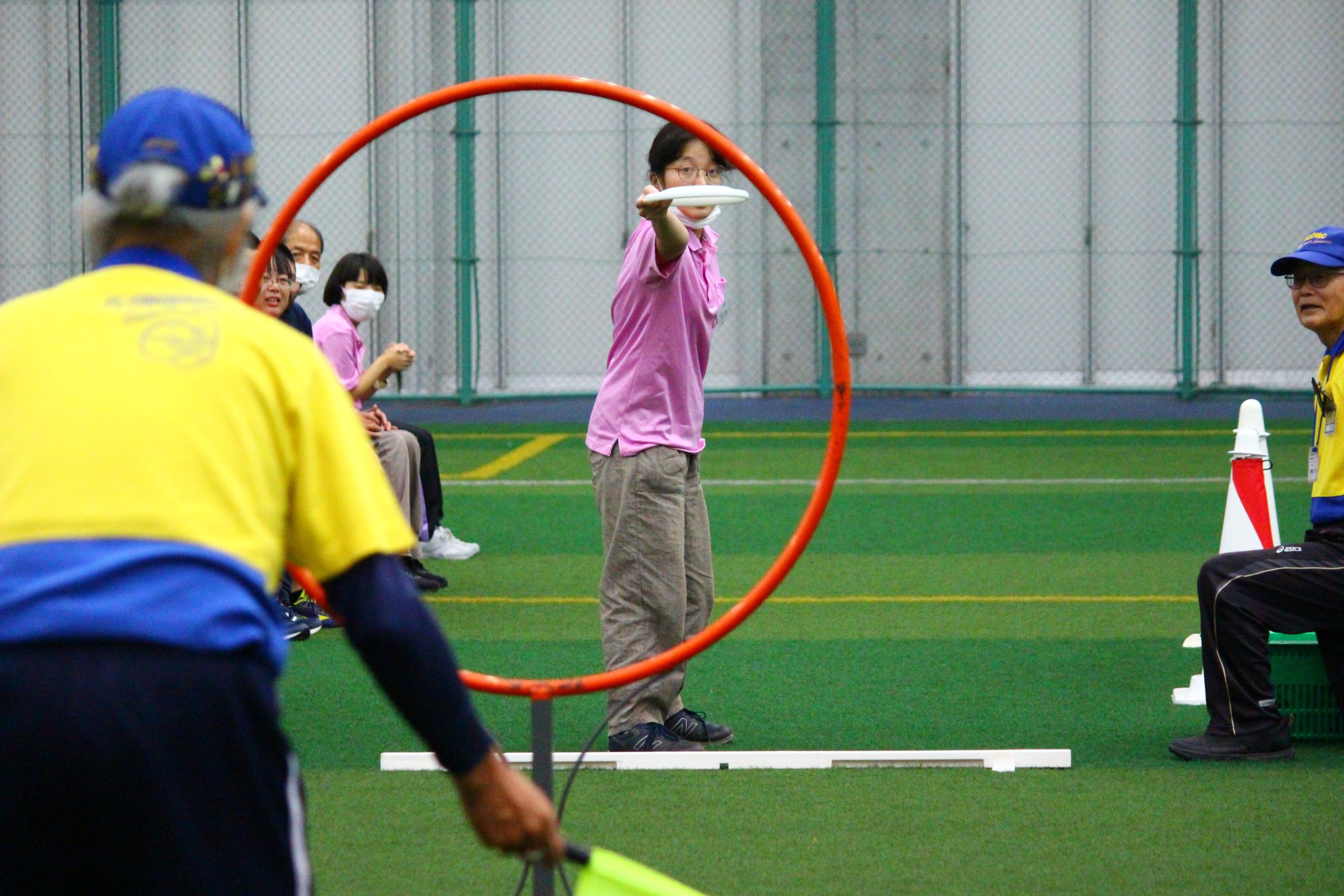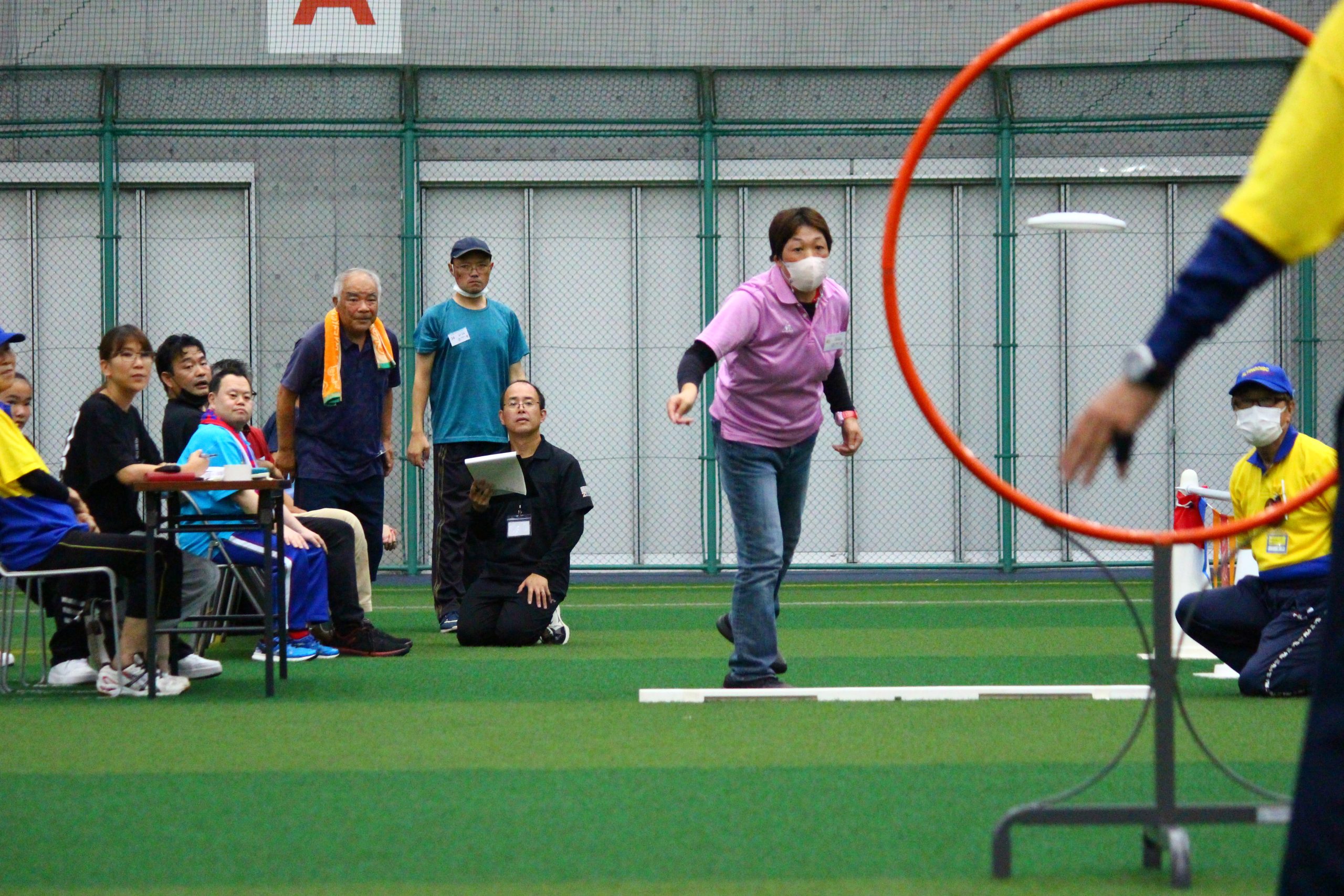 「アキュラシー」はゴール(内径91.5㎝)に向かって10回連続して投げ、通過した回数を競います。アキュラシーは障がいの区分も男女の区分もありません。本大会では、5m先のゴールを狙う「ディスリートファイブ」を行いました。