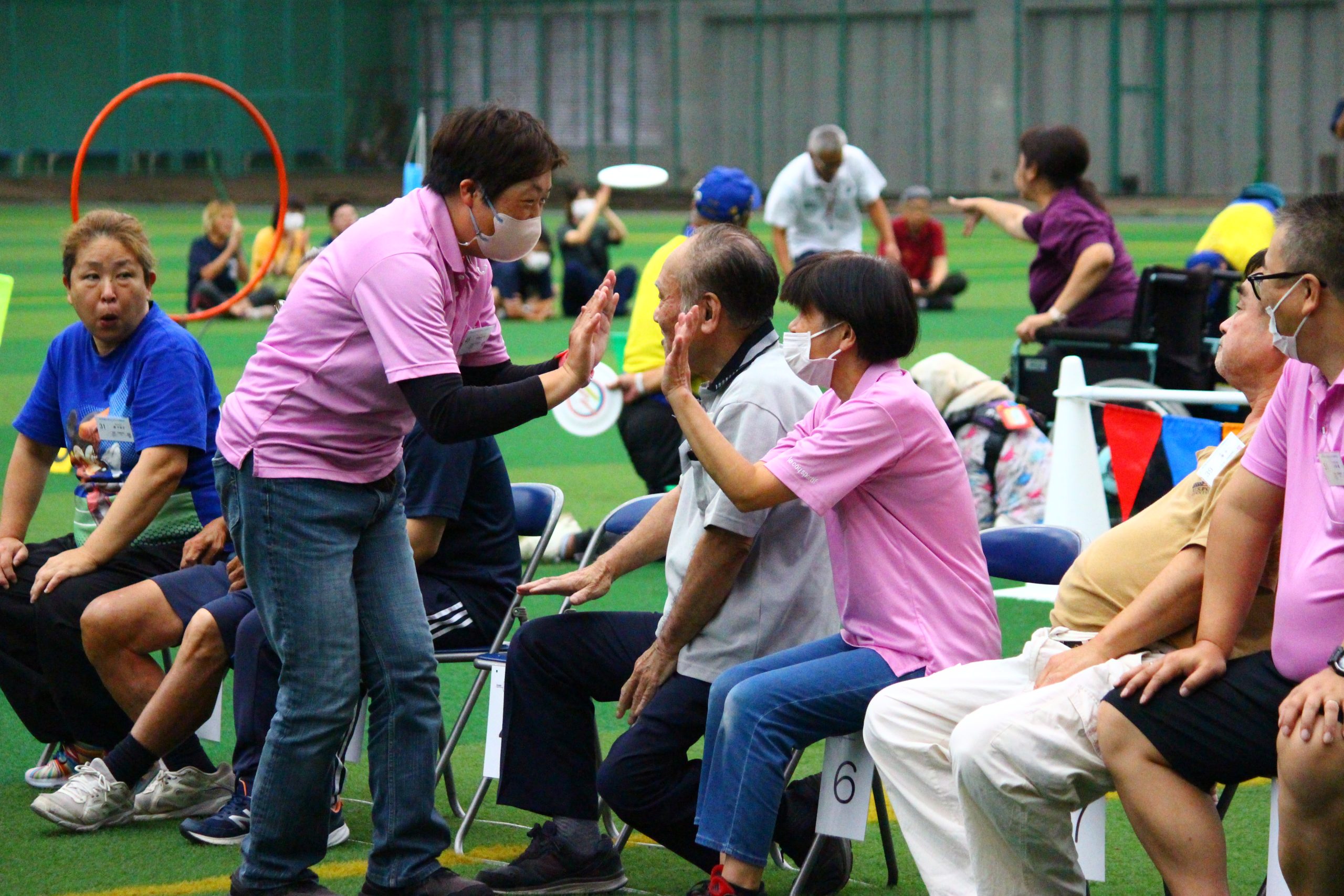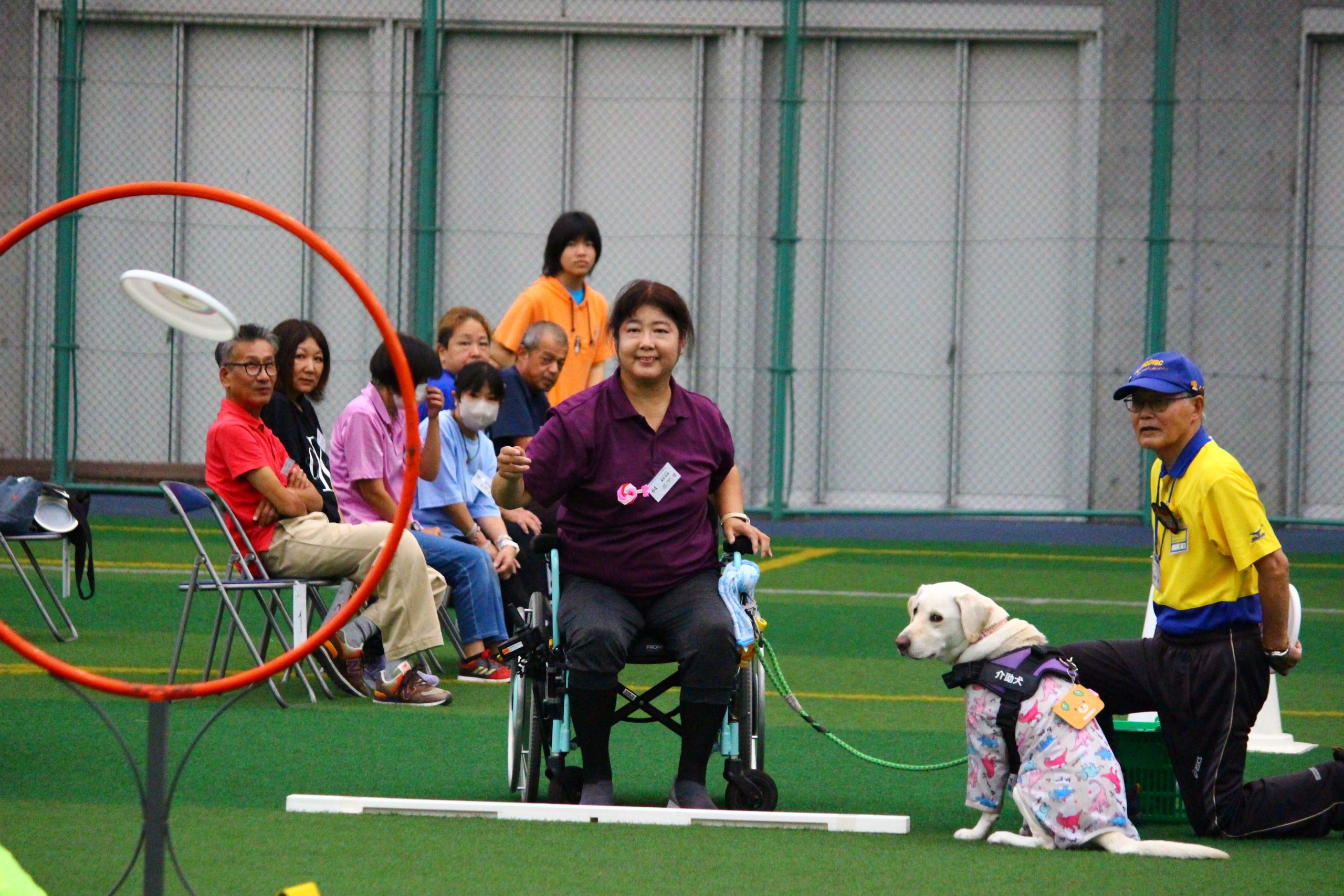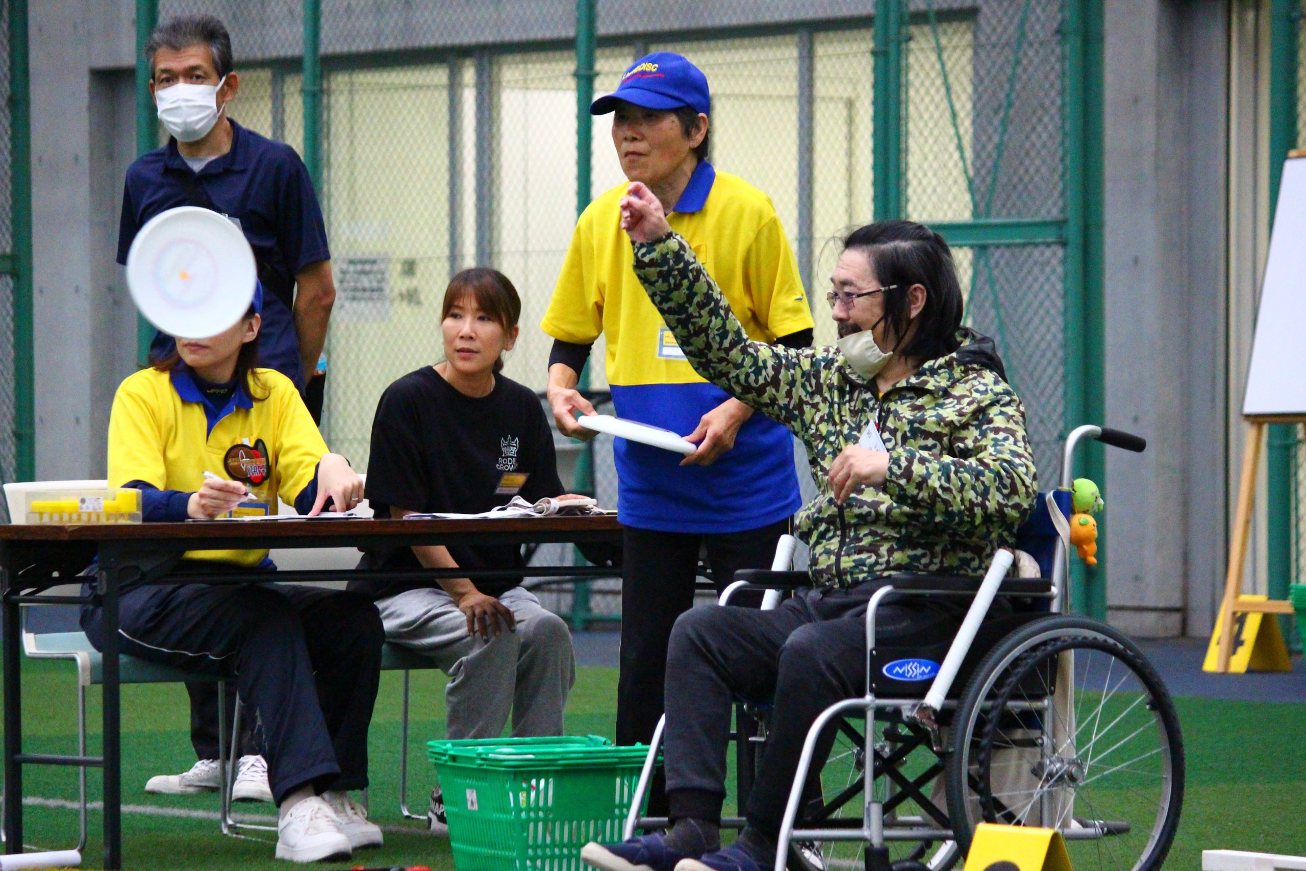 「アキュラシー」はゴール(内径91.5㎝)に向かって10回連続して投げ、通過した回数を競います。アキュラシーは障がいの区分も男女の区分もありません。本大会では、5m先のゴールを狙う「ディスリートファイブ」を行いました。